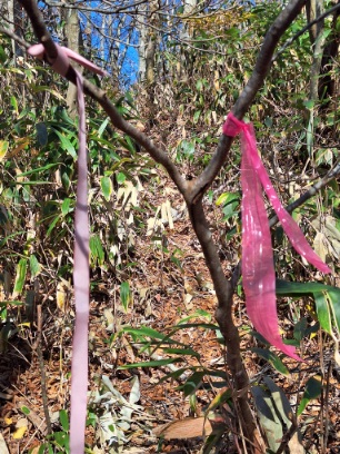 花房山でもベタベタ1mおきくらいに付けてたヤツと同じ付け方だ。もうすでにピンクテープあるのに、わざわざ自分でも付ける自己顕示欲の高さ。